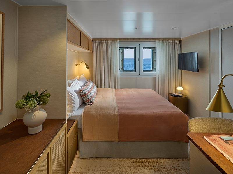 The Ocean Twin Stateroom offers a blend of elegance and practical design, featuring a large wardrobe and the option of twin or king bedding. Guests can enjoy the comfort of a spacious bathroom equipped with shower, heated floors, luxury amenities, and a hairdryer. For convenience and comfort, the stateroom includes individually-controlled air conditioning, international 240V sockets, USB charging points, and wall-mounted reading lamps. Entertainment needs are met with a flat-screen TV paired with an on-demand entertainment system. Additionally, guests are provided with complimentary and unlimited Wi-Fi, although connectivity may vary based on navigation and latitude.