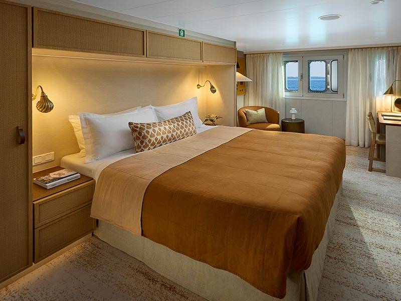 The Pearl Suite is sophisticated and meticulously crafted, complete with ample wardrobe space. It features floor-to-ceiling glass doors that lead to a private balcony. Guests have the option of twin or king bedding. The suite boasts a spacious bathroom equipped with shower, heated floors, luxury amenities, and a hairdryer. For personalised comfort, there is individually-controlled air conditioning, along with international 240V sockets, USB charging points, and wall-mounted reading lamps for convenience. Entertainment is provided through a flat-screen TV with an on-demand entertainment system. Additionally, guests can enjoy complimentary and unlimited Wi-Fi, although its connectivity may vary depending on navigation and latitude.