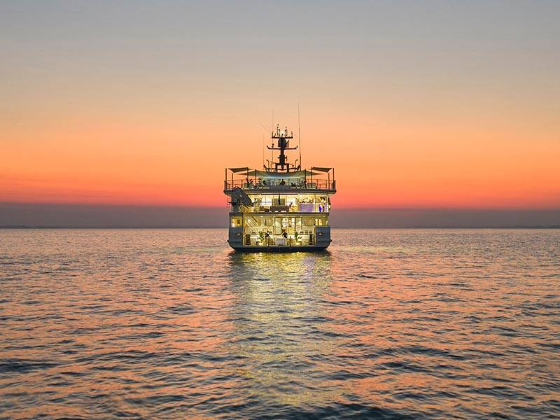 Life onboard befits being on your own elegant yacht. Enjoy stylish surroundings, thoughtful inclusions, friendly yet unobtrusive service, and cuisine designed by Serge Dansereau to satisfy your well-earned appetite, along with inclusive fine wines – champagne and Australian classics – a fine range of spirits and refreshing beers. Your accommodation presents with all the quality furnishings and toiletries you expect, while you have both outside or inside dining options, and plenty of comfortable areas to relax with new found friends to observe the wondrous land and seascapes. Sunsets have never looked better.